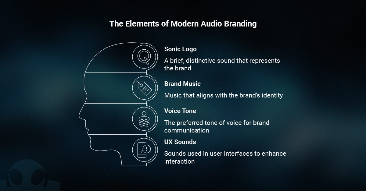 El audio branding es la creación de una identidad sonora cohesiva y estratégica que representa a la marca en todos los puntos de contacto auditivos. Incluye el sonic logo (el breve sonido distintivo, como el de Intel o Netflix), música de marca, tono de voz preferido, e incluso los sonidos de la interfaz de usuario (UX sounds).